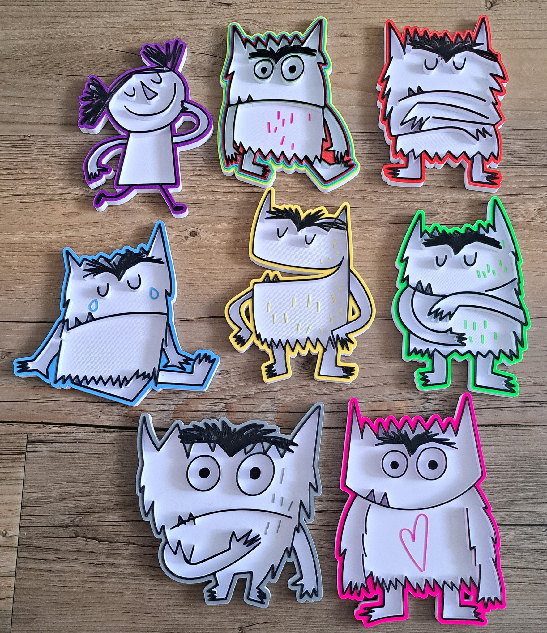 The shapes are 15cm high, except for "scared" which is 13cm high and "sad" which is 13.5cm high.
