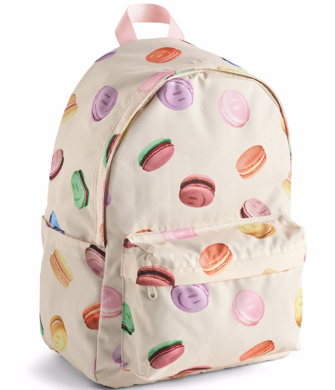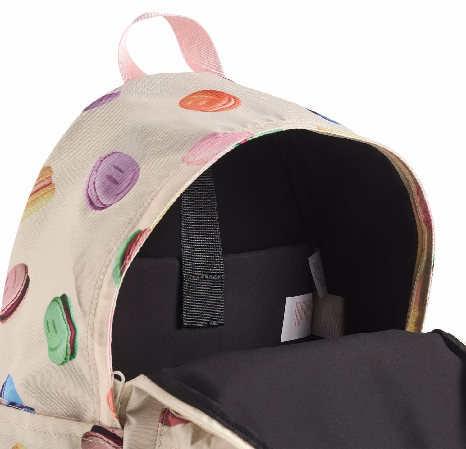 Cream-colored backpack with a macaron print. It features a padded compartment for a computer or tablet, a zippered front pocket, side bottle pockets, and padded straps. The adjustable chest strap and shoulder straps ensure good comfort and weight distribution. Dimensions: 30 x 17 x 42. Capacity: 21L.