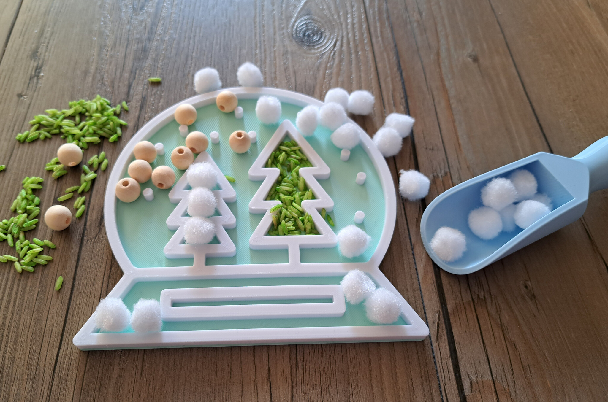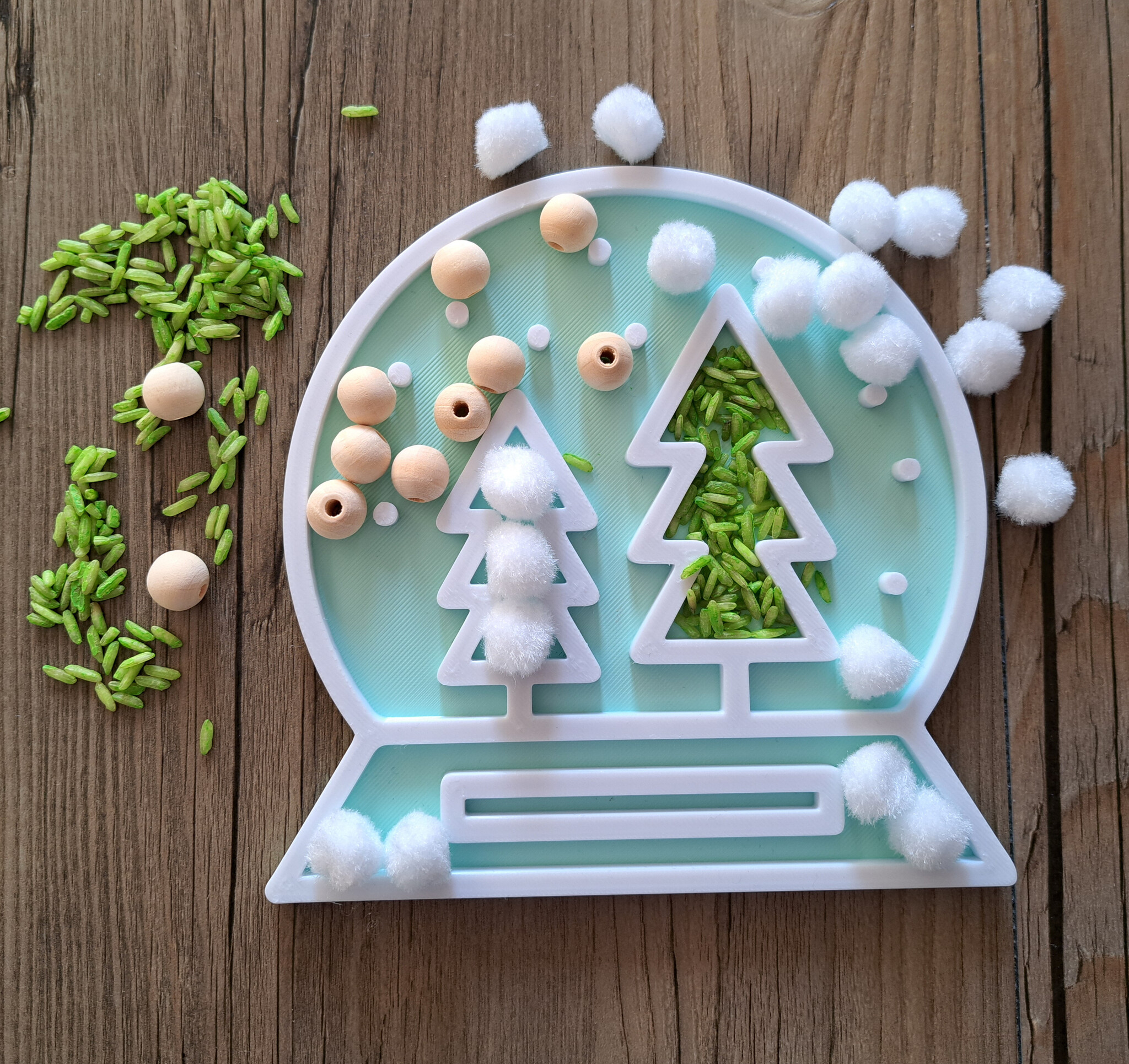 Nice Christmas filling mold* in the shape of a snow globe with Christmas tree representation. Fill with nice materials or press in the sand. Nice for at the play table/playtray. Can withstand water, let it dry well afterwards.