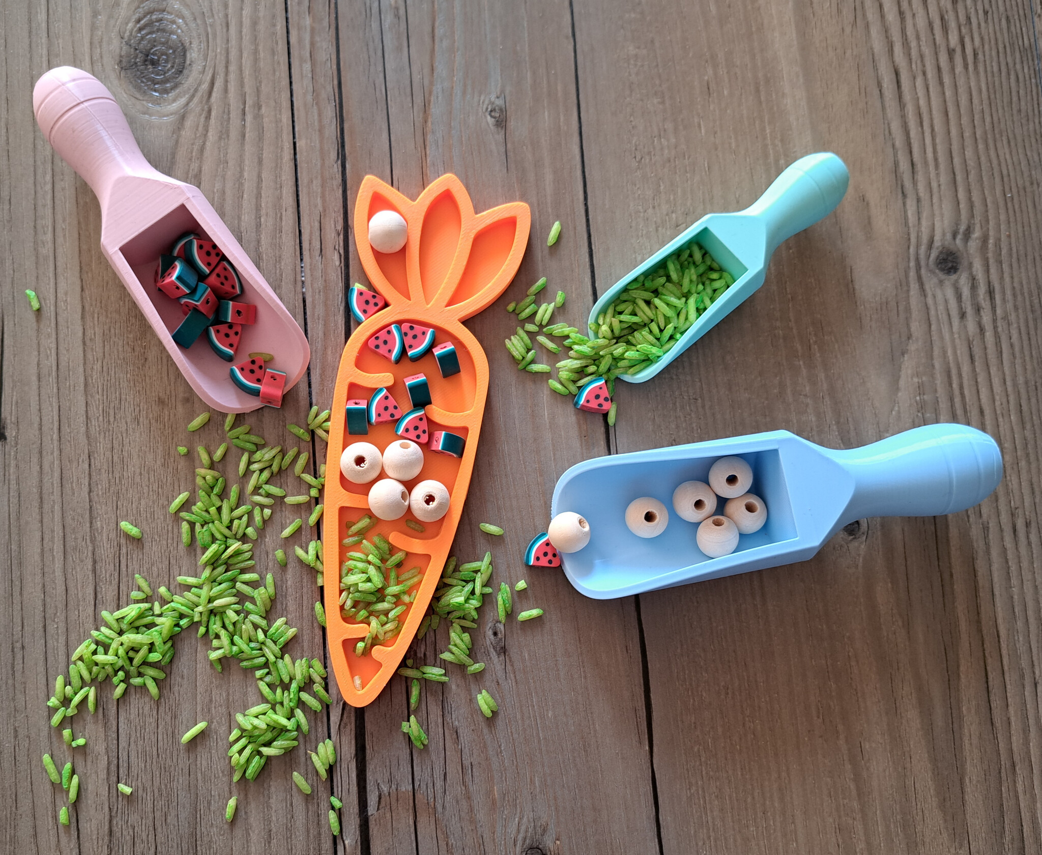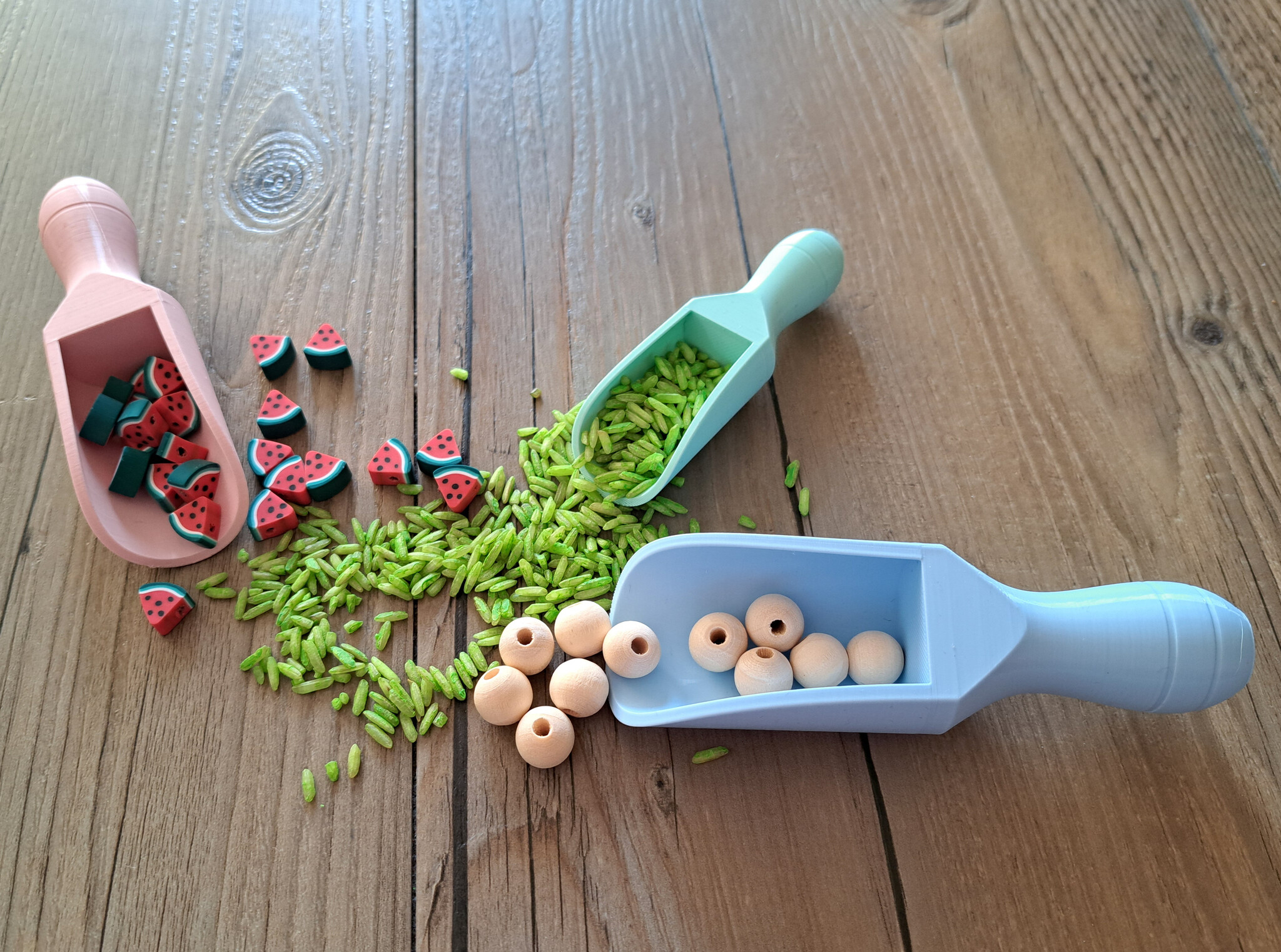 Nice little scoops, to use for all kinds of play material (sensory play). Use them at the play table/playtray or in the sand. Can withstand water, let it dry well afterwards.