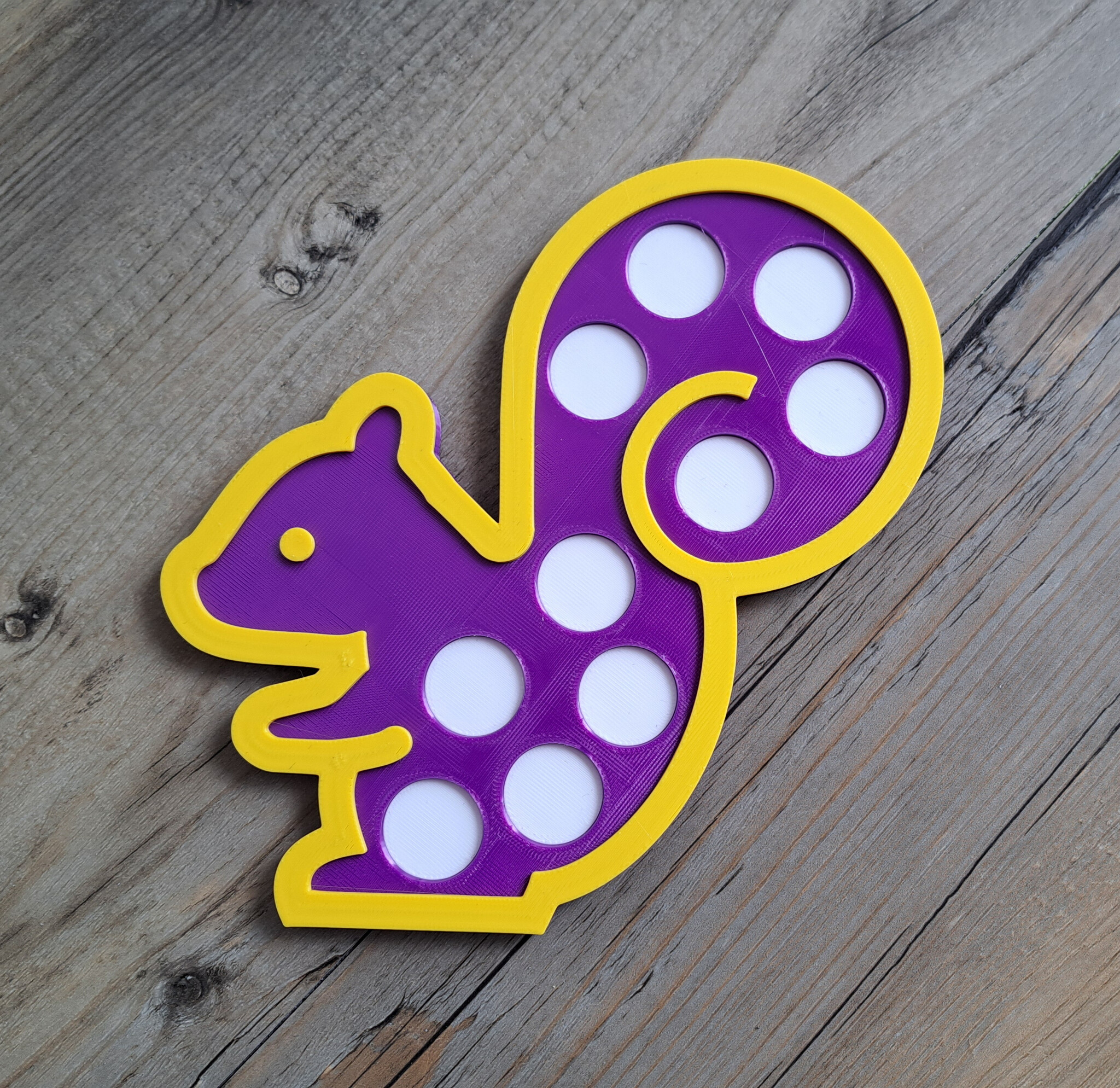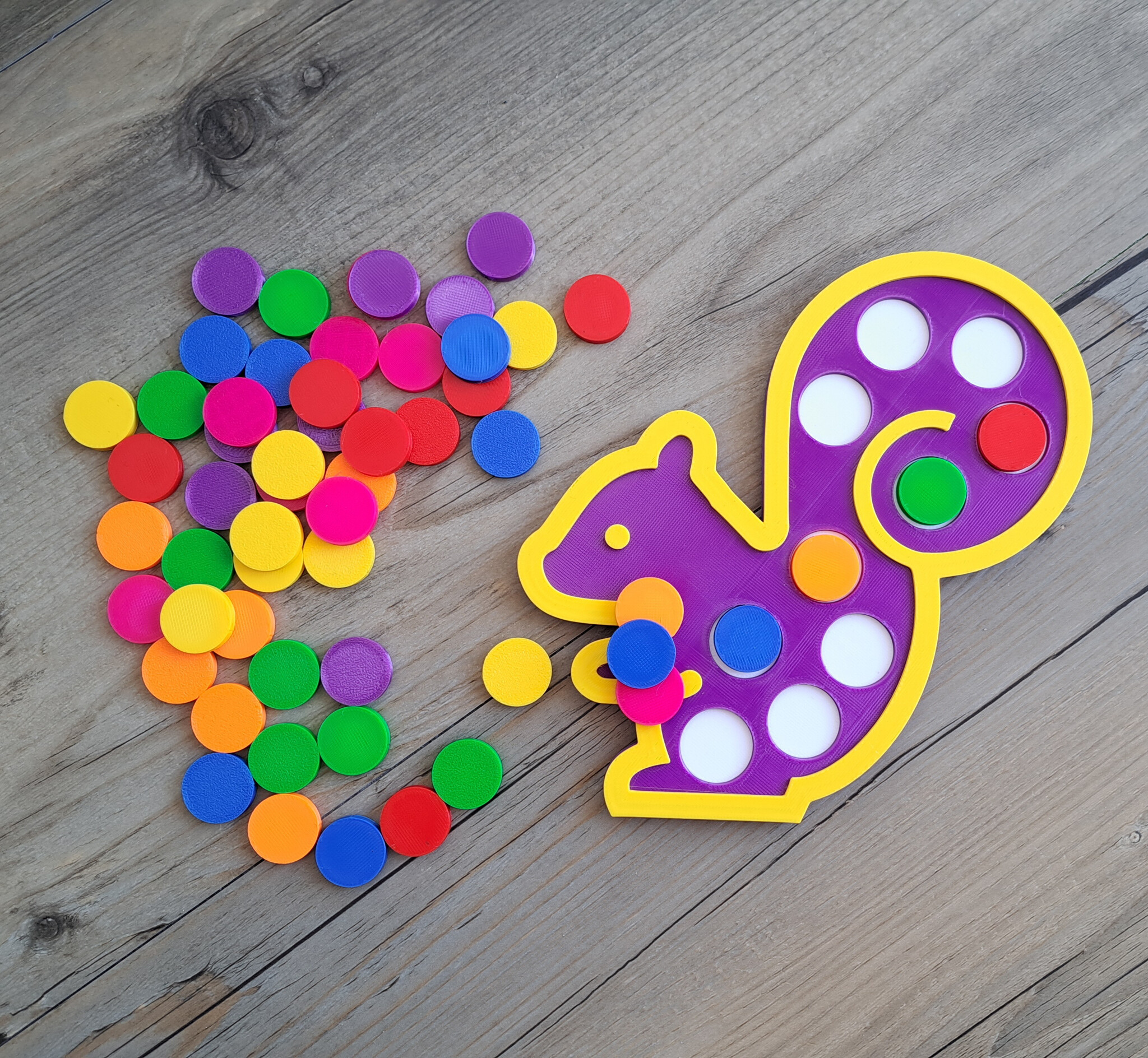 Cute squirrel with tokens (8 per color, 7 colors). Place the colored chips in the squirrel according to the example cards. Learn the colors, good for motor skills and of course just enjoy the game. Cool figure to use at school or at home.