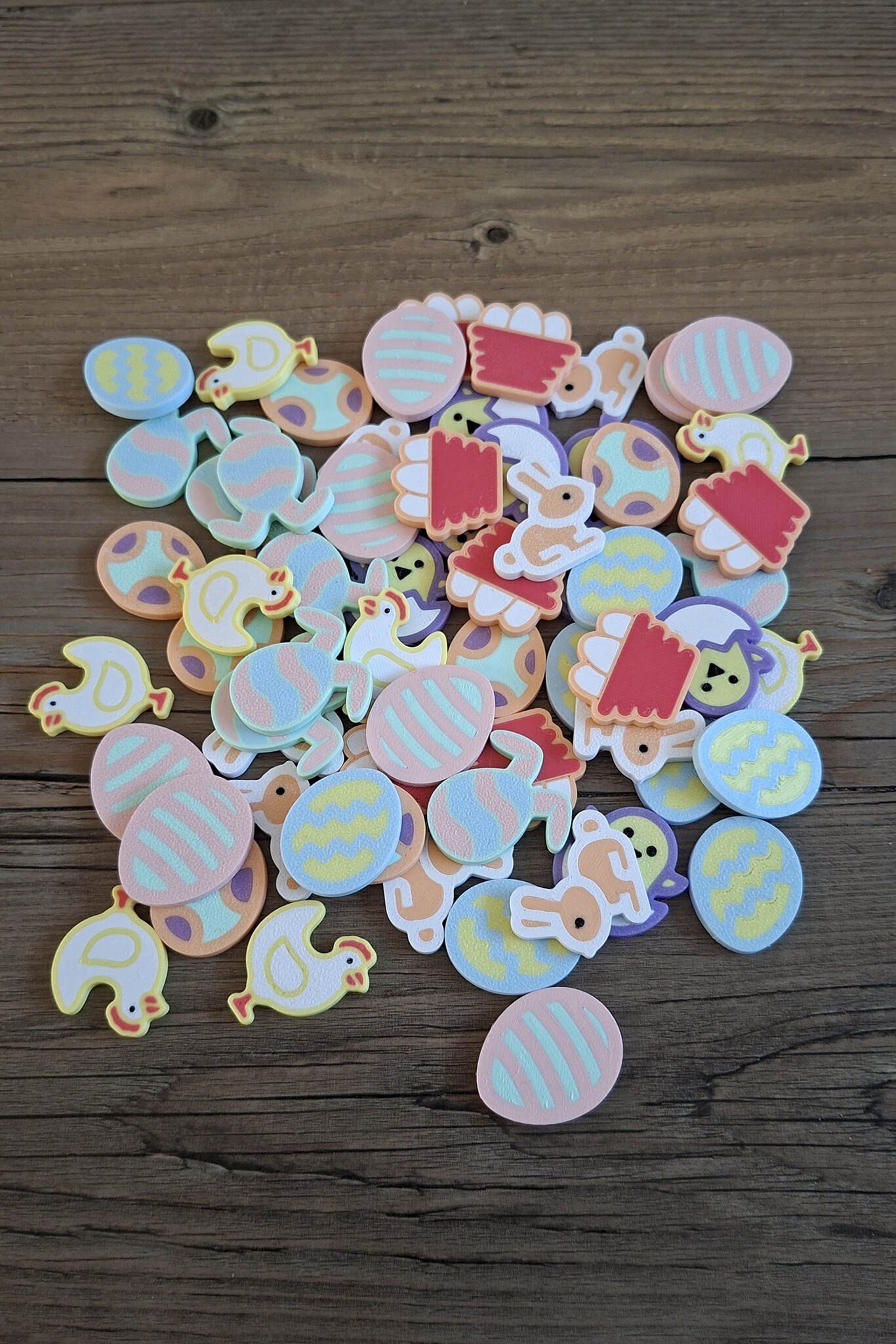 De mix bestaat uit 8 verschillende figuurtjes, van ieder figuurtje zijn er 8. Eén zijde is minimaal 2,5/3cm lang.