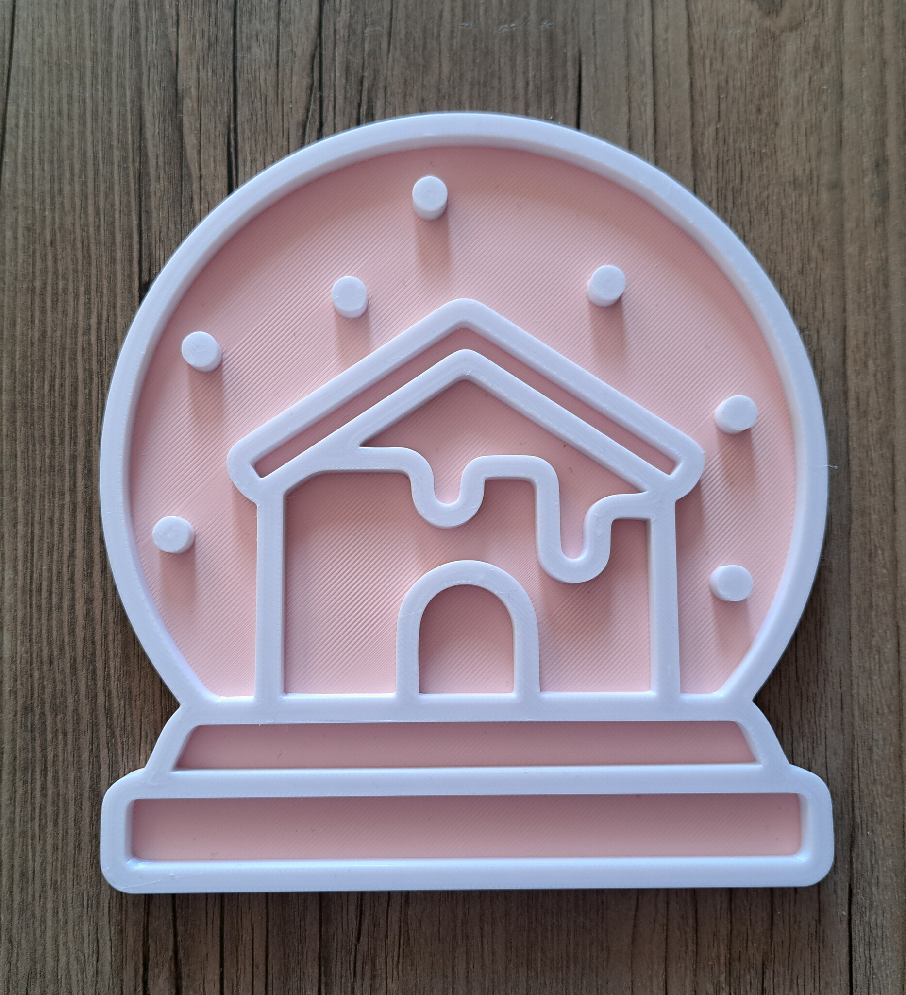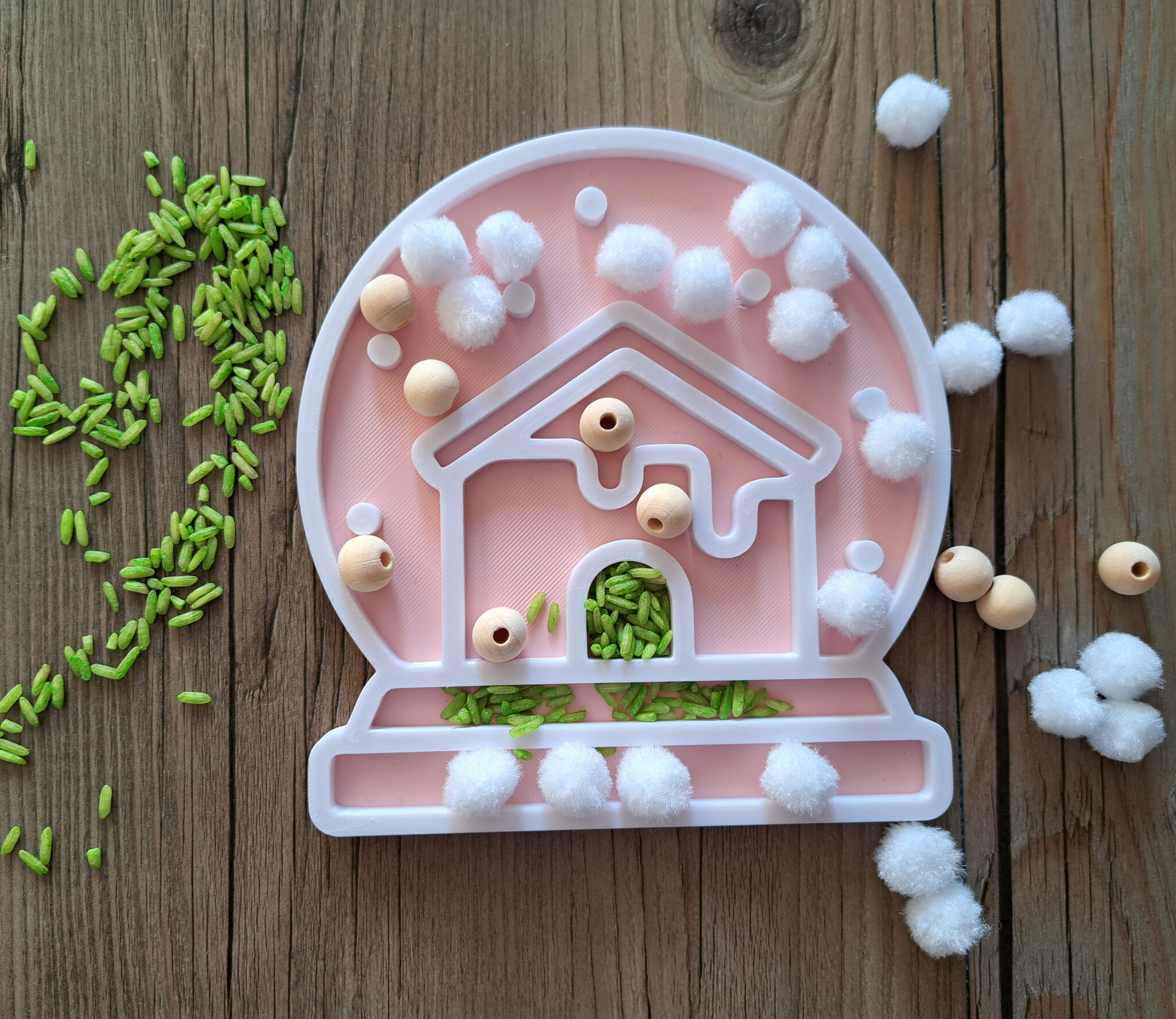 Leuke Kerst vulvorm* in de vorm van een sneeuwbol (snowglobe) met huis voorstelling. Vul met leuke materialen of druk in het zand. Leuk voor bij de speeltafel/playtray. Kan tegen water, daarna wel even goed laten drogen.
