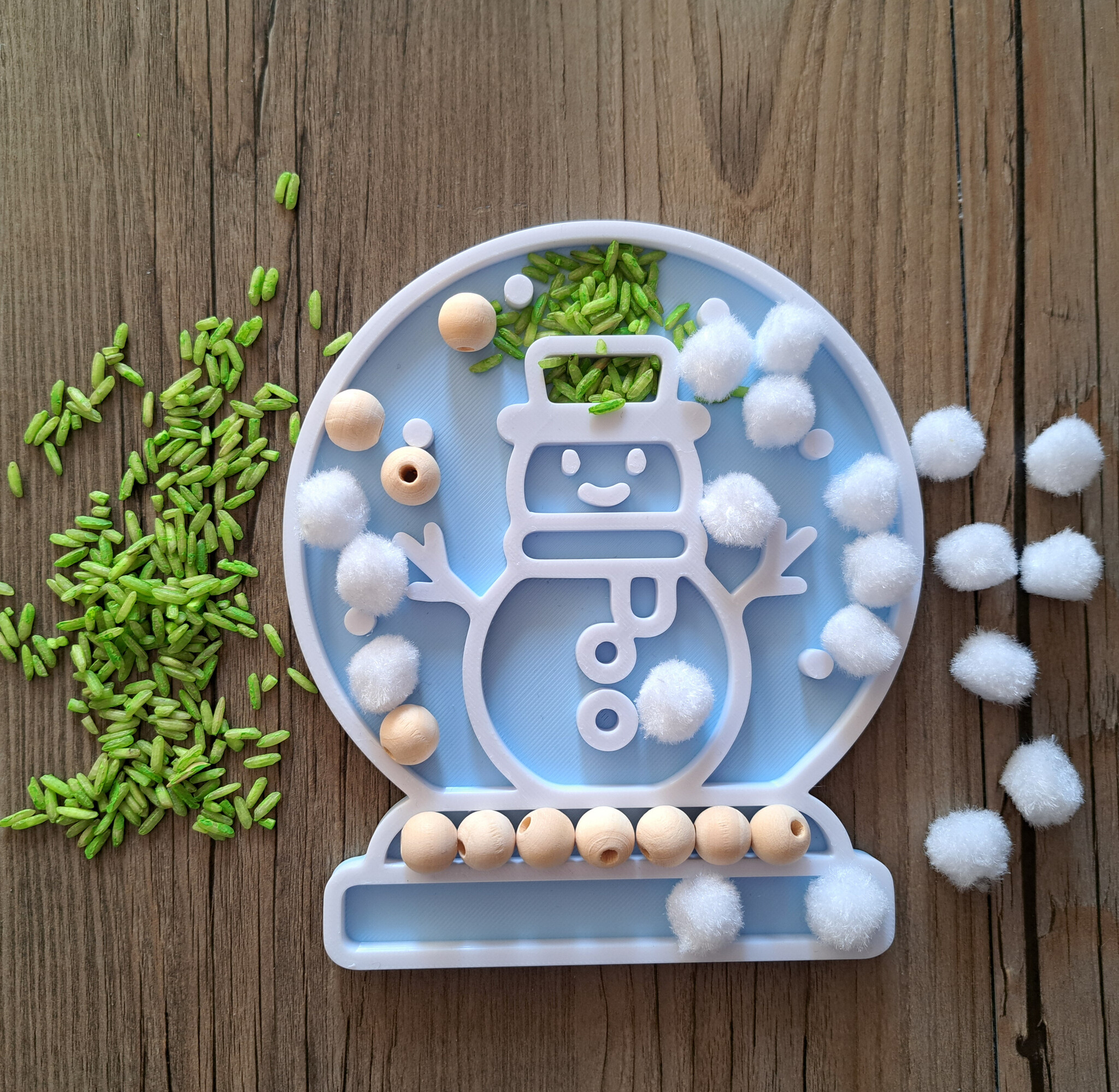 Leuke Kerst vulvorm* in de vorm van een sneeuwbol (snowglobe) met sneeuwpop voorstelling. Vul met leuke materialen of druk in het zand. Leuk voor bij de speeltafel/playtray. Kan tegen water, daarna wel even goed laten drogen.