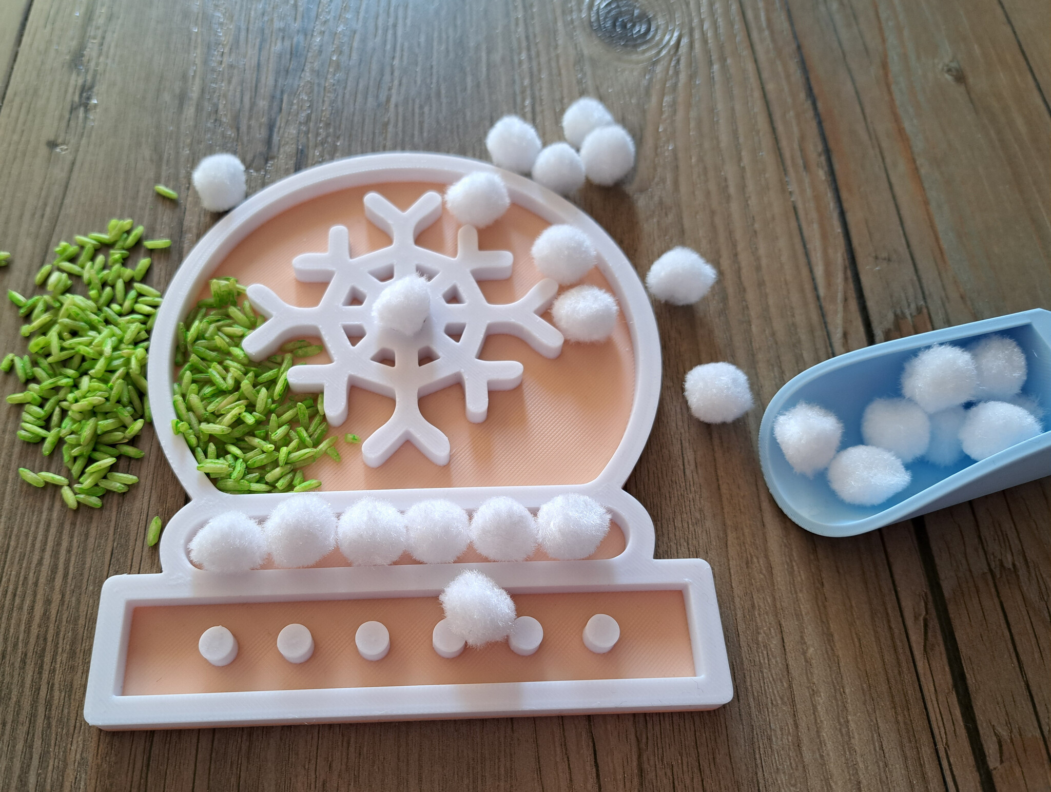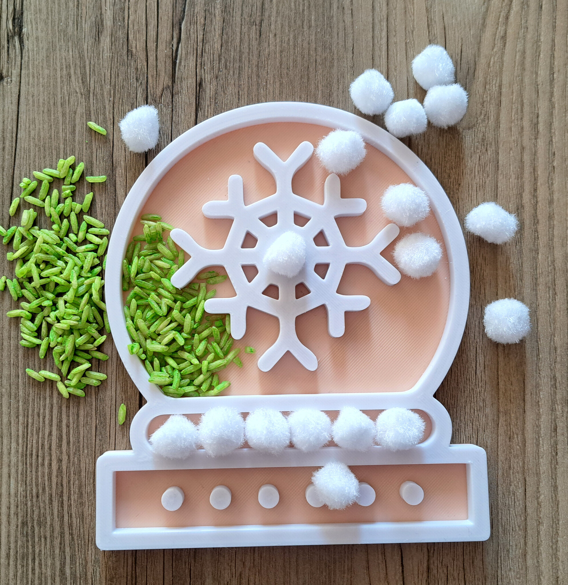 Leuke Kerst vulvorm* in de vorm van een sneeuwbol (snowglobe) met (sneeuw)ster voorstelling. Vul met leuke materialen of druk in het zand. Leuk voor bij de speeltafel/playtray. Kan tegen water, daarna wel even goed laten drogen.